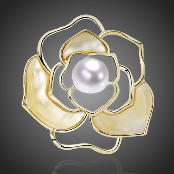 Nádherná dámska brošňa v zlatom kvete s lastúrou, vyzdvihnutá v strede bielou riečnou perlou Vám dodá nádych elegancie. Zachováva si dlhotrvajúci lesk a jas. Antialergické.