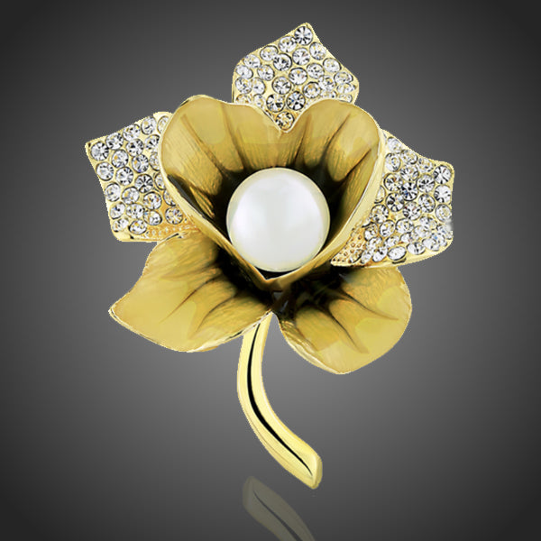 Krásna kvetinová brošňa v žltočiernej olejomaľbe vyzdvihnutá shell perlou a čírymi zirkónmi. Zachováva si dlhotrvajúci lesk a jas. Antialergické.