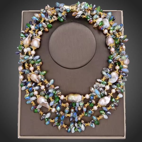Exkluzívny štvoradový neprehliadnuteľný náhrdelník s pravými prírodnými keshi perlami rôznych tvarov doplnený modro fialovo zelenkavými kvalitnými krištáľmi s rôznymi odleskami v dekolte vynikne. Jeho dizajn z neho robí skvost. Každý kus je ručne vyrobený originál. Pre jedinečnú dámu. Antialergické. Zapínanie na pevný zlatý magnet alebo na okrasné poistné zapínanie.