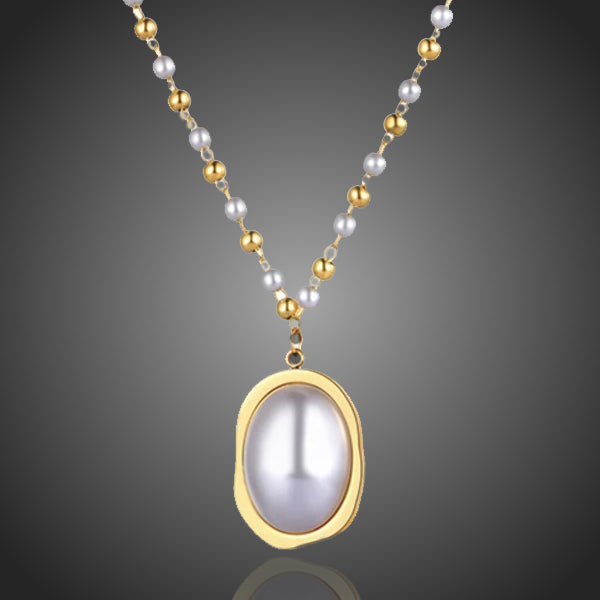 Krásny náhrdelník so zaujímavou retiazkou so zlatými guľočkami a drobnými perličkami doplnený výraznou krištáľovou perlou v dekolte vynikne. Zachováva si dlhotrvajúci lesk a jas. Antialergické.