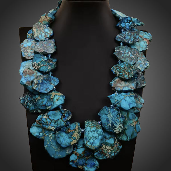 Exkluzívny dvojradový neprehliadnuteľný náhrdelník s modrým prírodným imperial jaspisom pripomínajúcim farbami rôzne odtiene oceánu. Jeho dizajn z neho robí skvost. Každý kus je ručne vyrobený originál. Pre jedinečnú dámu. Antialergické.