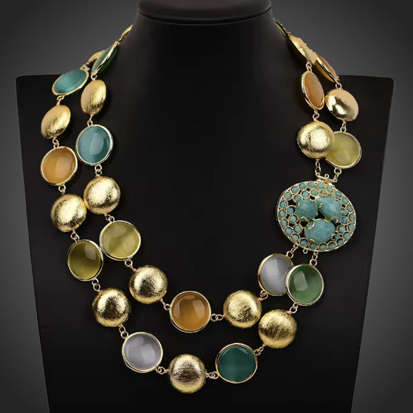 Exkluzívny dvojradový neprehliadnuteľný náhrdelník s efektnou sponou z prírodného modrého amazonitu doplnený zelenými a hnedými kvalitnými krištáľmi a zlatými okrúhlymi aplikáciami, ktoré mu dodávajú punc elegancie. Skvost, ktorý zaujme. Každý kus je ručne vyrobený originál. Pre jedinečnú dámu. Antialergické.