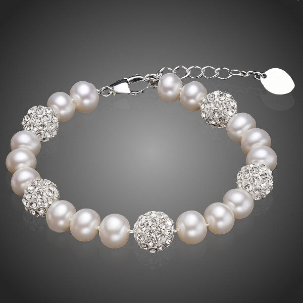Perlový náramok v kombinácii s bielymi riečnymi perlami a krištáľovými guličkami sa stane Vašim efektným doplnkom. Zapínanie si vďaka galvanizácii platinou zachováva dlhotrvajúci lesk a jas. Antialergické.