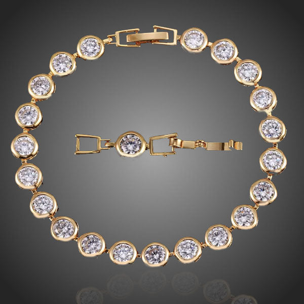 Žiarivý dámsky ladnýnáramok vykladaný čírymi zirkónmi sa stane efektným doplnkom. Súčasťou je aj 2 cm predĺženie na obrázku, ktoré môžete použiť. Vďaka kvalitnej galavnizácii 3 vrstvou žltého zlata si zachováva si dlhotrvajúci lesk a jas. Bez obsahu niklu, olova, kadmia. Antialergické.