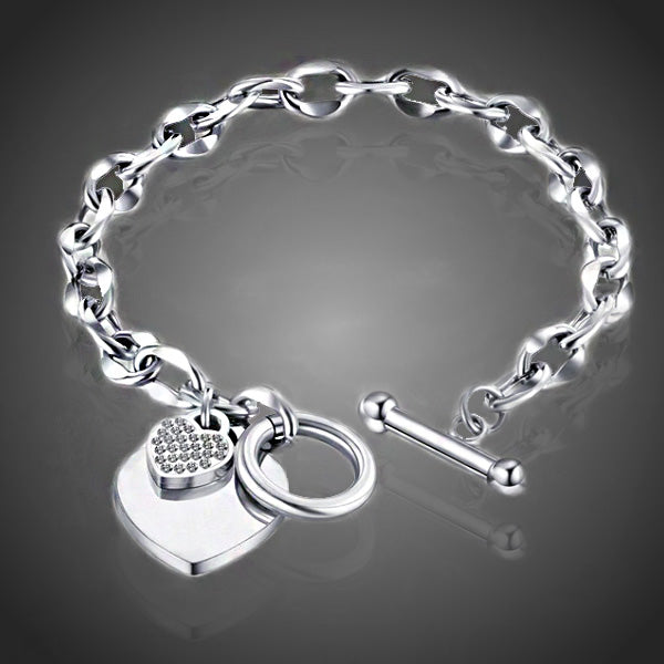 Srdiečkový dámsky náramok z chirurgickej ocele vo farbe bieleho zlata doplnený drobnými čírymi krištáľmi sa stane Vašim milým spoločníkom. Zachováva si dlhotrvajúci lesk a jas. Antialergické.