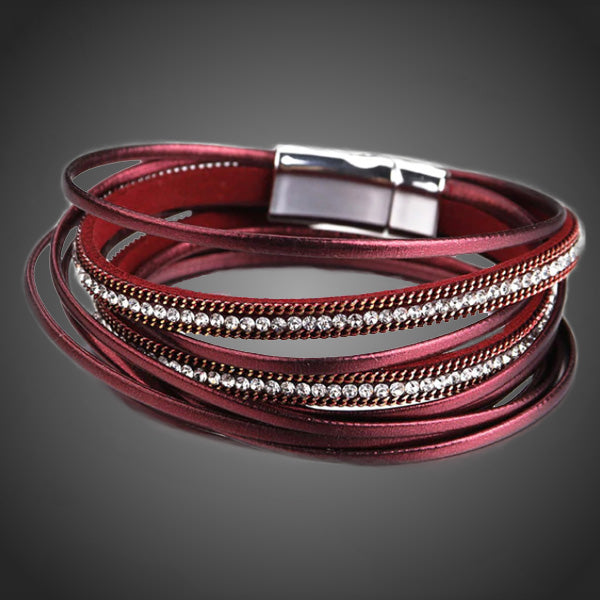 Trendy kožený bordový náramok s čírymi krištáľmi. Náramok sa obmotáva okolo ruky. Uzatváranie na magnet. Antialergické.