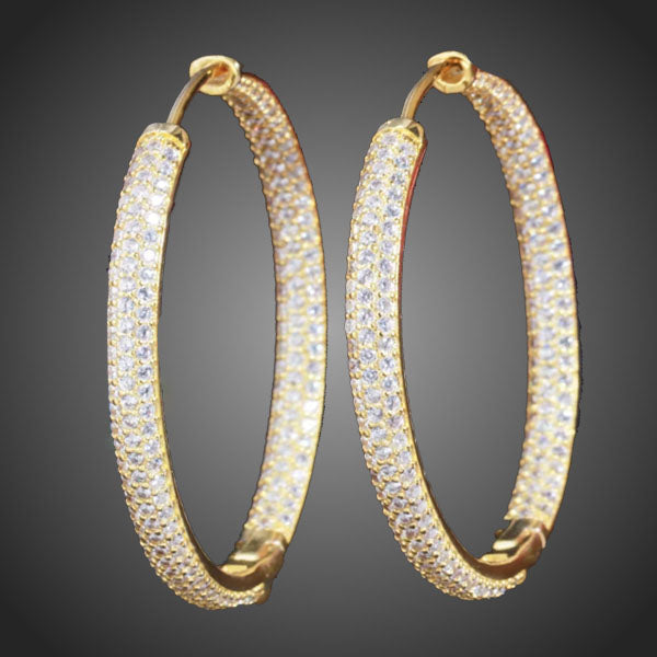 Obľúbené kruhové náušnice vykladané stovkami žiarivých čírych zirkónov s diamantovým odleskom pomocou špeciálnej techniky micropave. Vďaka galvanizácii 3 vrstvou žltého zlata si dlhotrvajúci lesk a jas. Bez obsahu niklu, olova, kadmia. Antialergické.