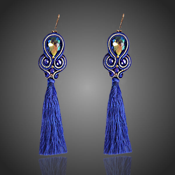 Módny hit. Ručne šité modré náušnice soutache technikou s krištáľom a strapcami. Antialergické. V reále sú nádherné.
