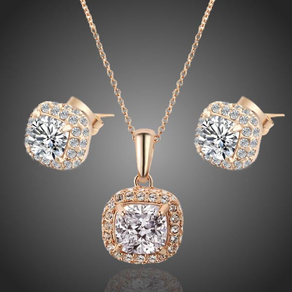 Elegantný obľúbený set s ladnými kockami doplnený čírymi krištáľmi. Trendy farba ružového zlata Vás poláska. Vďaka kvalitnej galvanizácii si zachováva dlhotrvajúci lesk a jas. Bez obsahu niklu, olova, kadmia.