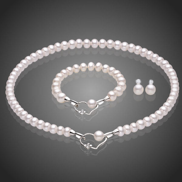 Nádherný perlový set s bielymi riečnymi perlami doplnený uzatváraním z odnímateľných srdiečok. Set pôsobí nežne a stane sa elegantným doplnkom. Srdiečko s jemným kvietkom je možné dať na retiazku a nosiť ho aj samostatne. Náušnice sú s perlou doplnené jemným zirkónom na vrchu. Dĺžka 44 cm je jemná a elegantná, pri ktorej perly najkrajšie vyniknú pri krku. Zapínanie si vďaka galvanizácii trojvrstvou platiny zachováva dlhotrvajúci lesk a jas. Antialergické.