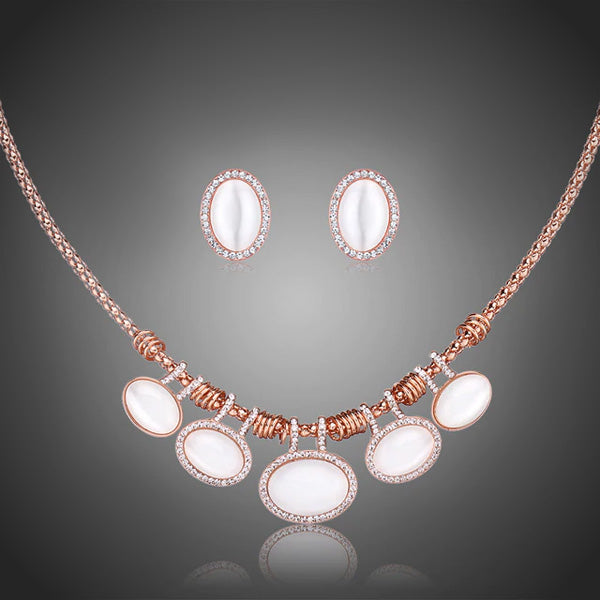Výnimočný set s módnymi opálmi vynikne v ženskom dekolte. Farba ružového zlata Vás poláska. Vďaka kvalitnej galvanizácii si zachováva dlhotrvajúci lesk a jas. . Bez obsahu niklu, olova, kadmia. Antialergické.