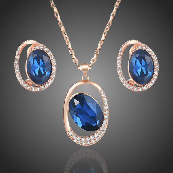 Krásny set v ladnom tvare s veľkými modrými krištáľmi doplnený čírymi krištáľmi v dekolte zažiari. Trendy farba ružového zlata Vás poláska. Vďaka kvalitnej galvanizácii si zachováva dlhotrvajúci lesk a jas. Bez obsahu niklu, olova, kadmia. Antialergické.