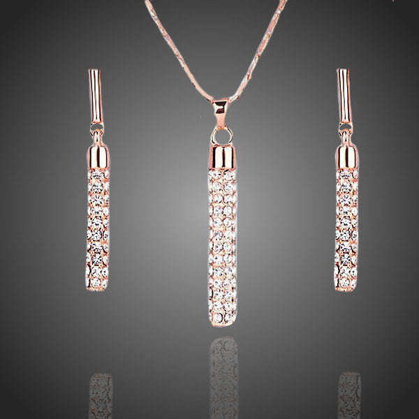 Elegantný set s krásnou líniou prívesku a náušníc s čírymi krištáľmi z Vás urobí dokonalú dámu. Trendy ružové zlato rozžiari outfit. Vďaka kvalitnej galvanizácii si zachováva dlhotrvajúci lesk a jas. Bez obsahu niklu, olova, kadmia. Antialergické.
