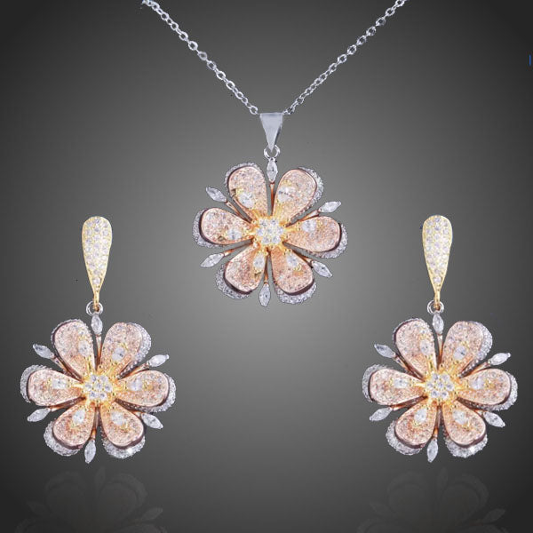 Nádherný set s ladnými kvetmi, vykladanými žlto-oranžovými zirkónmi, rozžiari každý deň teplým nádychom slnka. Zirkóny v odtieňoch zlatistého jantáru a medového lesku sa ligocú pri každom pohybe a vytvárajú dojem tanca svetla ukrytého v kvetoch. Každý detail setu je precízne spracovaný – od jemných lupeňov až po žiarivý stred, ktorý symbolizuje energiu, radosť a ženskosť.Vďaka kvalitnej galvanizácii si zachováva dlhotrvajúci lesk a jas. Bez obsahu niklu, olova, kadmia. Antialergické.