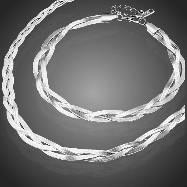 Elegantný moderný náhrdelník s náramkom z chirurgickej ocele s pevnými troma prepletanými retiazkami vo farbe bieleho zlata uchváti. Zachováva si dlhotrvajúci lesk a jas. Antialergické.